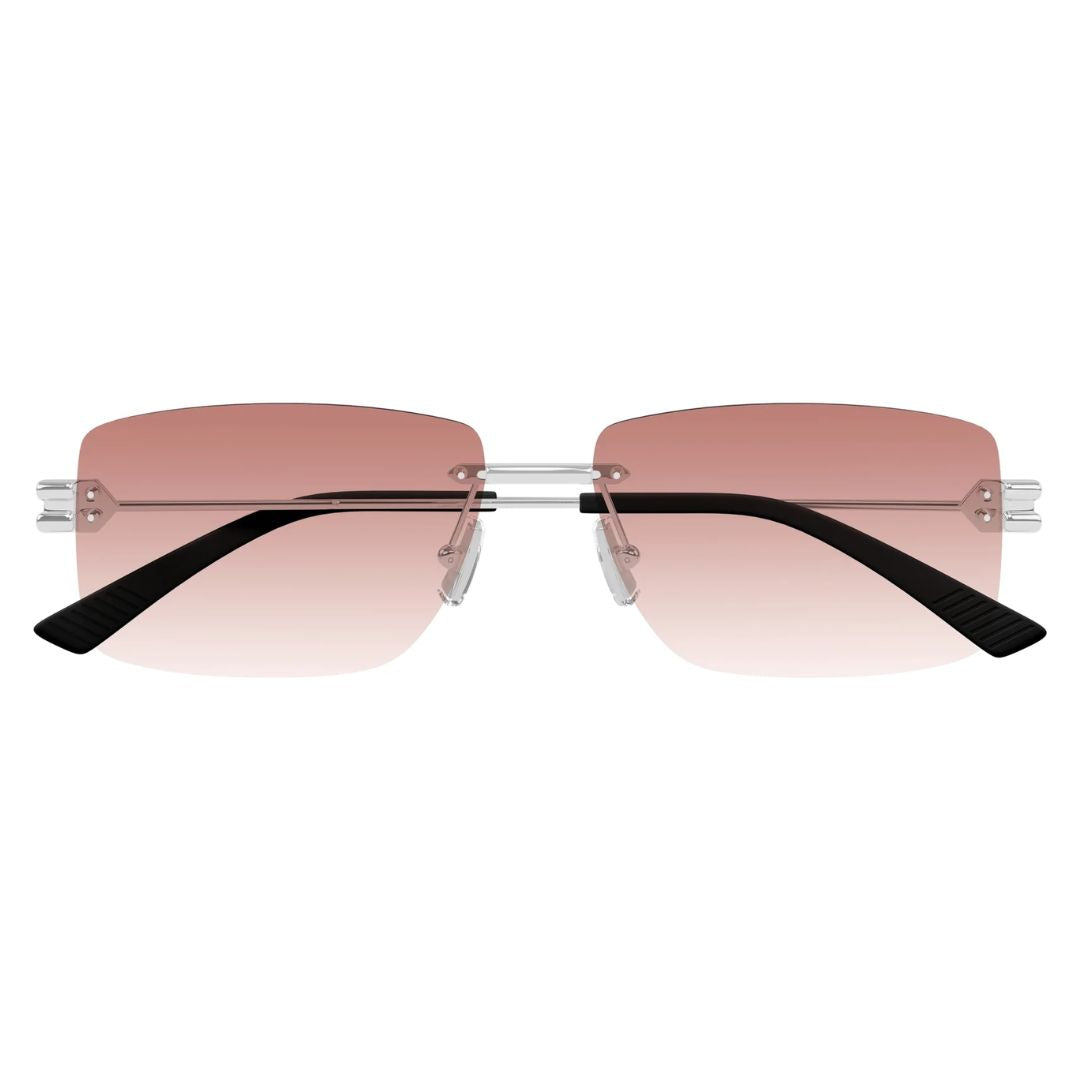 The Bottega Veneta BV1126S 007 sunglasses feature a polished silver, rimless rectangular design paired with elegant burgundy gradient lenses. Lightweight metal temples with the signature Bottega “Lock” detail provide comfort and a refined touch. Made in Italy, this model blends minimalist luxury with a bold, modern aesthetic.