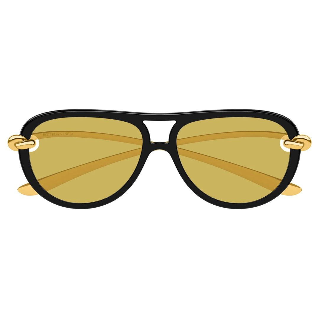 The Bottega Veneta BV1418S 001 sunglasses feature a vintage-inspired aviator silhouette with a glossy black injected frame and refined gold temples. The signature knot detail adds a luxurious accent, while the nicotine (light brown) lenses provide a warm and elegant finish.