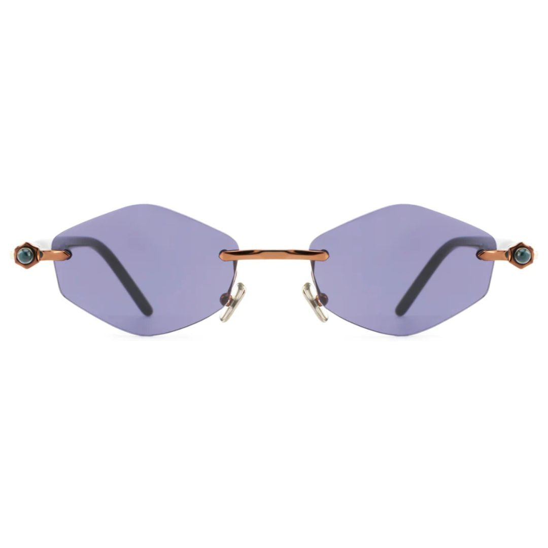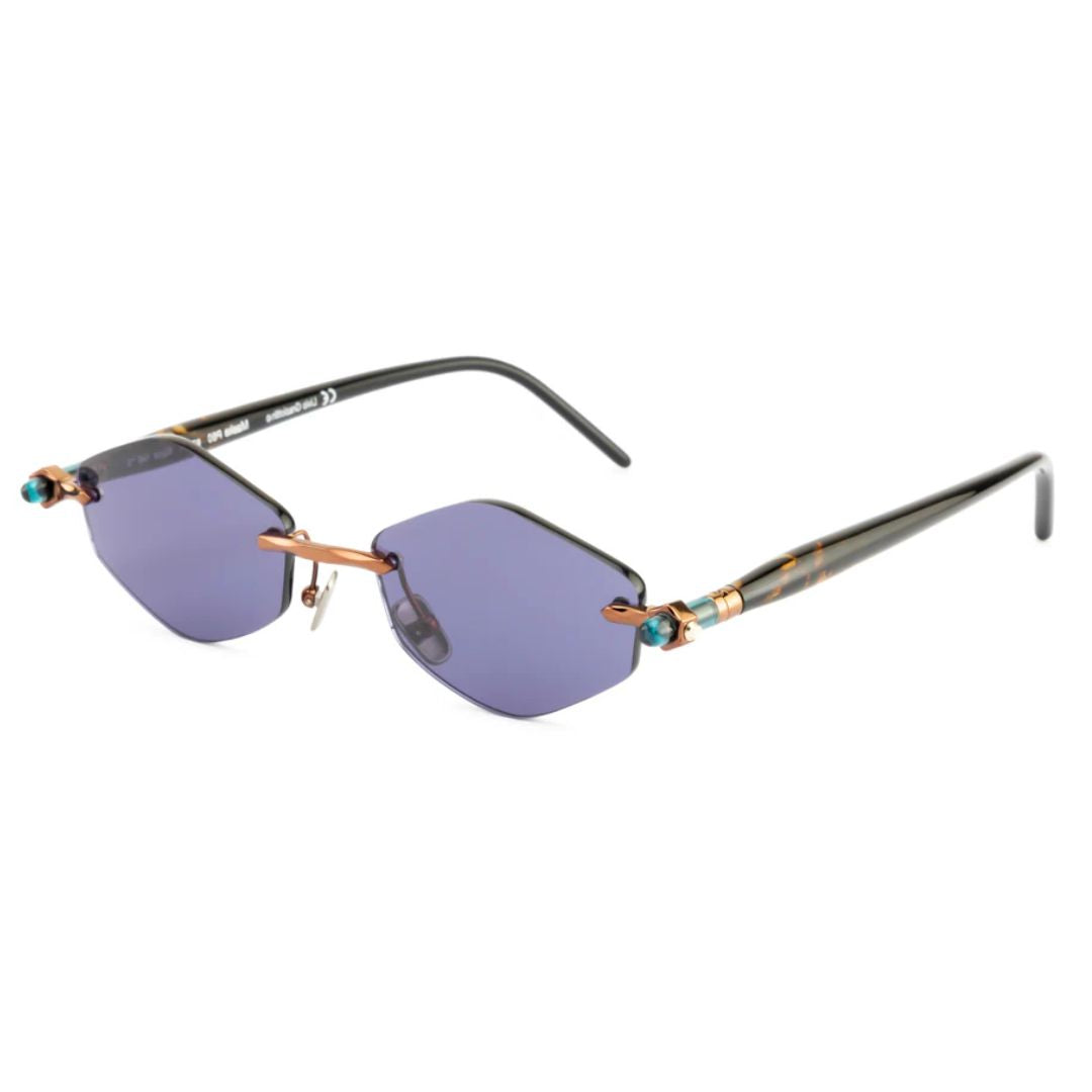 The Kuboraum Maske P60 BZ GH sunglasses present a striking rimless geometric design with violet-tinted lenses and a sculptural bronze frame accented by gold-tone details. Handmade in Italy, this bold and expressive model perfectly embodies Kuboraum’s vision of eyewear as art and identity. Designed to suit both men and women, it combines innovation with contemporary luxury.