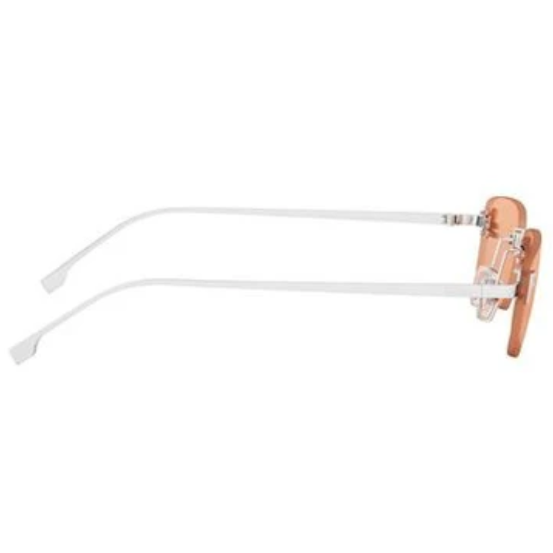 The Fendi FE4172US 16J sunglasses from the First Crystal collection feature a modern rectangular design crafted in silver metal. Their rimless aesthetic with orange-tinted lenses creates a sleek, contemporary look that exudes luxury and sophistication.